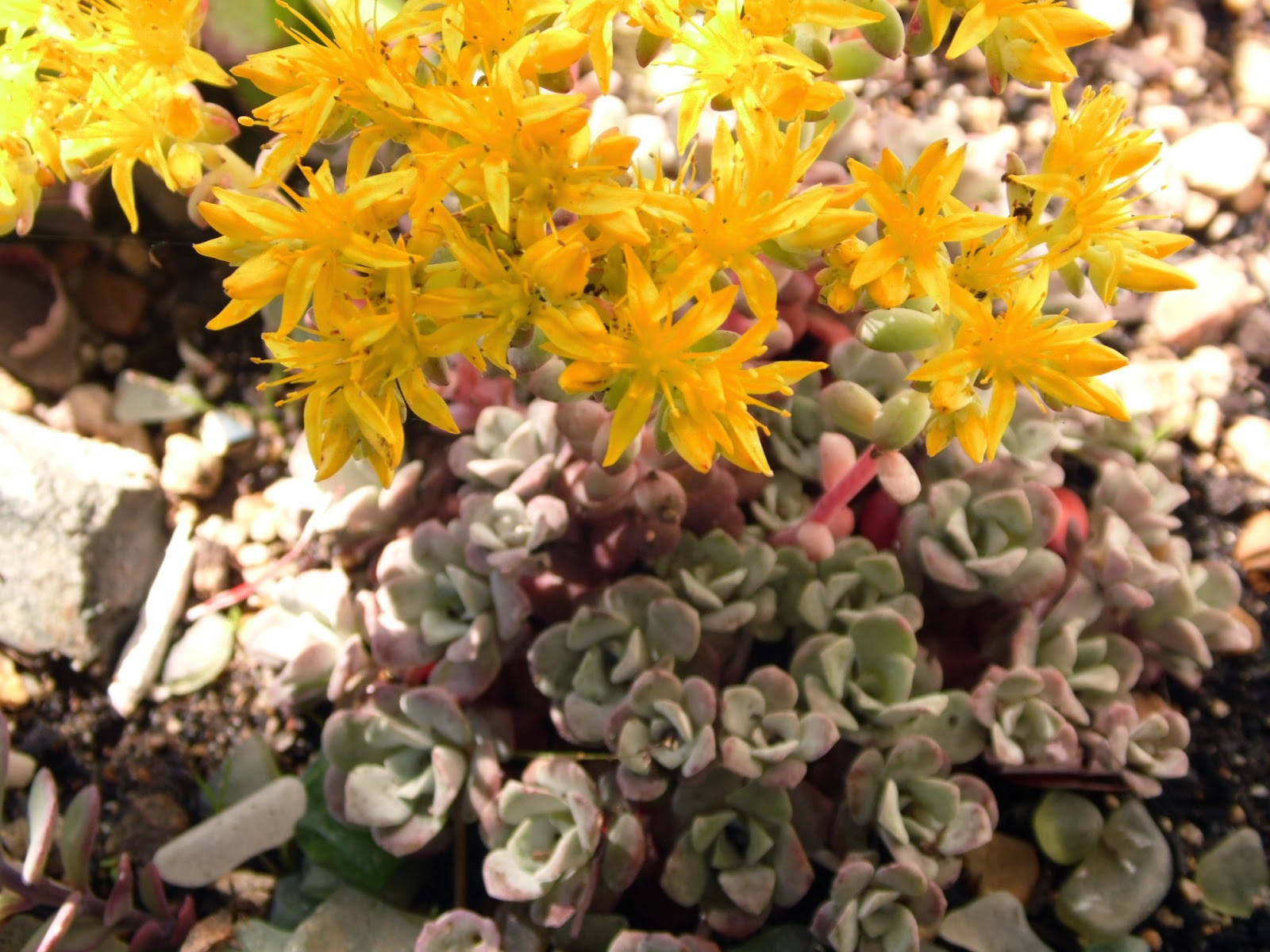 | George rebuilt this dry stone wall it fell after rain. I have been balancing pots all around with tomatoes and Geraniums. |